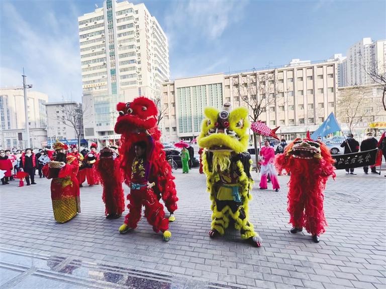 社區(qū)工作人員、舞獅隊(duì)、社火隊(duì)和大鼓隊(duì)為轄區(qū)居民帶來了扭秧歌、舞獅、敲大鼓、大頭娃娃和劃旱船等表演。
