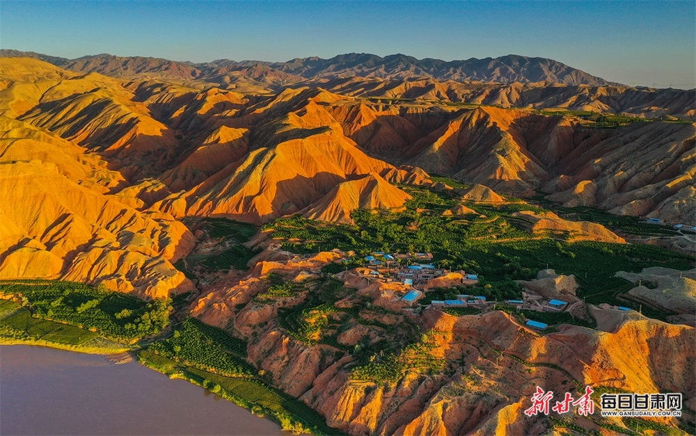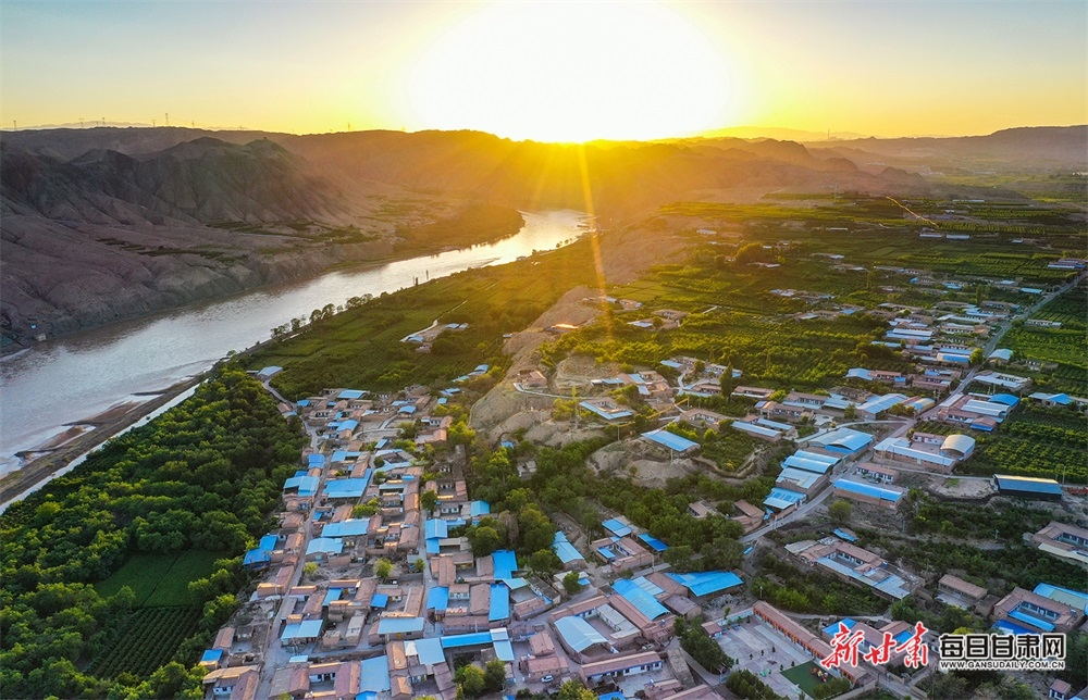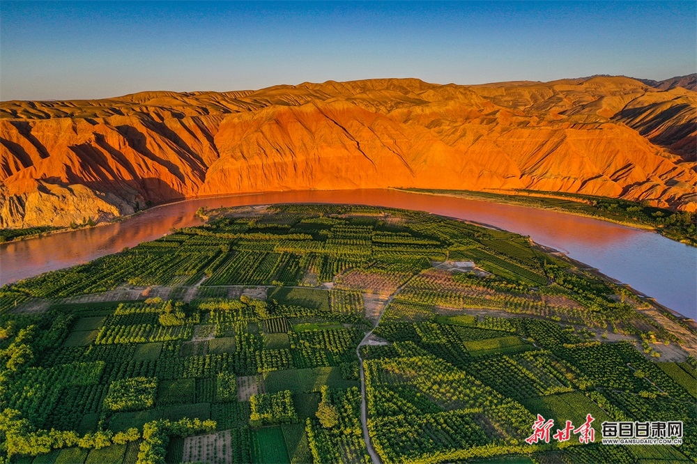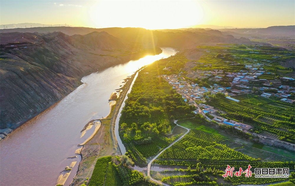 夏日,夕陽西下,黃河在景泰五佛鄉(xiāng)境內(nèi)的車木峽繞了個(gè)大大的彎,位于黃河峽谷中的 車木峽山村高山環(huán)繞,周圍是成片的樹林,廣袤的田野閃耀著瑰麗的色彩,靜靜地躺在綠色的懷抱之中。