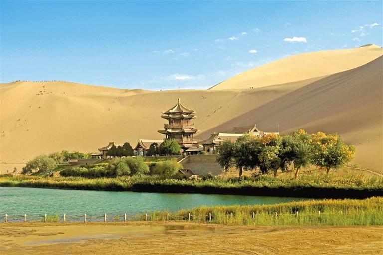 這是10月4日拍攝的甘肅省敦煌市鳴沙山月牙泉景區(qū)。金秋時(shí)節(jié),神州大地秋景如畫,盡顯大美中國山河錦繡。 新華社照片