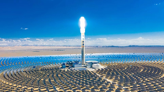 位于甘肅省敦煌市光電產業(yè)園區(qū)的首航高科敦煌100兆瓦熔鹽塔式光熱電站內,1萬余面定日鏡以同心圓狀圍繞著260米高的熔鹽塔逐日發(fā)電。敦煌市委宣傳部供圖