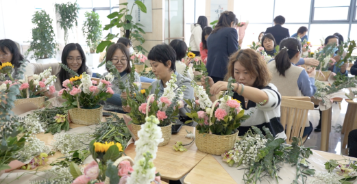 繁花似錦報春來,天姿國色抒情懷?;顒蝇F(xiàn)場花香四溢、芬芳溫馨,充滿著春天般的氣息,大家手捧鮮花,在花藝老師的講解下,開始學習各種鮮花所蘊含的花語祝福和選花、裁剪、搭配、造型及養(yǎng)護等藝術(shù)插花技巧。隨后,女工們將原本普普通通的月季、康乃馨、蝴蝶蘭、滿天星、向日葵等多種花材修剪整枝,根據(jù)不同的色彩和形狀有層次地搭配在一起。通過精心構(gòu)思造型、發(fā)揮創(chuàng)意想象,有的注重意境創(chuàng)設追求,有的突出枝情花韻之趣,有的抒展自然樸實風格……在細致地修飾和精心地創(chuàng)作下,一枝花、一棵草都變得詩情畫意和清新怡人,節(jié)日的喜慶氣氛瞬間升騰。