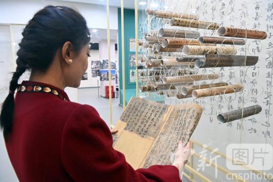 3月14日,敦煌研究院敦煌文獻(xiàn)研究所所長趙曉星接受中新社記者專訪介紹稱,全彩印《敦煌文獻(xiàn)全集》出版工作已正式啟動(dòng),該叢書采用全彩印的方式刊布敦煌文獻(xiàn),實(shí)現(xiàn)敦煌文獻(xiàn)在線下圖錄中的高清還原。敦煌文獻(xiàn),又稱敦煌遺書,是指1900年在甘肅敦煌莫高窟藏經(jīng)洞發(fā)現(xiàn)的公元4世紀(jì)至11世紀(jì)的寫本、印本和拓片等文獻(xiàn)。據(jù)最新統(tǒng)計(jì)顯示,其總數(shù)近7萬件。目前這些文獻(xiàn)分藏于中、英、法、俄、日等國的數(shù)十家收藏機(jī)構(gòu),一直缺乏完整的聯(lián)合目錄。圖為3月3日,工作人員在敦煌藝術(shù)館卷軸墻前閱覽敦煌遺書影印品。 中新社記者 九美旦增 攝
