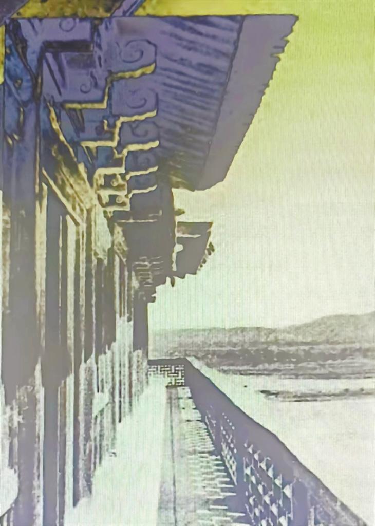 林競《西北叢編》一書載,其與蘭州友人于1919年2月7日出游雷壇河臥橋,“橋長十余丈,其形如弓,橋上蓋屋,足蔽風雨,五彩繪畫,兩端有坊,東曰‘空中鰲背’,西曰‘天上慈航’,橋底無墩,自遠望之,宛如臥龍。”林競還詳細記錄了蘭州雷壇河臥橋的建造方法,并對之科學性表示肯定:“聞此橋原來有墩,因某年山洪爆發(fā),被其沖毀,自是始改今式。其法,先將兩岸之橋基筑好,以數(shù)丈長之巨木直列成排,復以橫木連之,木材之數(shù),依橋之寬狹而定,其前端伸出橋中約二三尺,其后端即以巨石壓之,如是疊架不已,每加一層,即前端伸過下層數(shù)尺,如倒掛之階梯然。而層與層之間,復聯(lián)以鐵環(huán)及釘木,迨兩岸相距不遠時,即以巨木渡之。此種構造,在西北往往因河水湍急,不能筑墩,或游牧之民,不知在河中建筑橋墩之法而始用之。然亦甚合於力學原理,未可忽視也。”