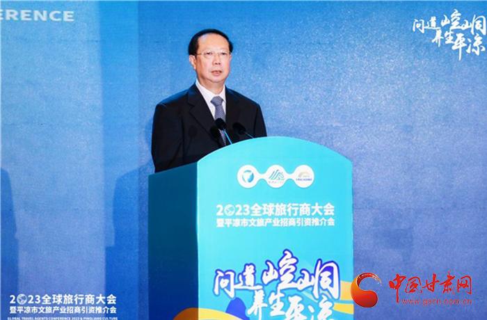 何效祖在致辭中說,平?jīng)鍪歉拭C向東開放的“門戶”城市,是風(fēng)景宜人的旅游城市,是甘肅布局的文旅康養(yǎng)基地和支撐“一核三帶”區(qū)域發(fā)展格局中的重要支點,擁有崆峒山、大云寺·王母宮、瑤池溫泉等眾多聞名遐邇的人文和自然景觀。今天,我們與平?jīng)鍪形姓⒅袊眯猩鐓f(xié)會、甘肅公航旅集團一道搭建平臺,誠邀各位嘉賓走進甘肅、深入平?jīng)?,組織開展宣傳推介、洽談合作、展示展銷、考察踩線等系列活動,就是要引導(dǎo)大家深度感知甘肅高質(zhì)量發(fā)展的強烈愿望,實地觸摸甘肅文旅如火如荼的生動實踐,誠懇表達(dá)隴原兒女“視企業(yè)家為最寶貴財富”的真誠合作和赤誠服務(wù)之心。我們衷心希望,廣大中外旅行商和文旅專家、文旅企業(yè)家以本次大會為契機,加強交流互鑒,深化務(wù)實合作,加大在甘投資力度,組織更多游客到甘肅觀光旅游,帶動更多優(yōu)質(zhì)文旅企業(yè)和項目落戶甘肅,合力譜寫甘肅文旅高質(zhì)量發(fā)展的嶄新篇章!