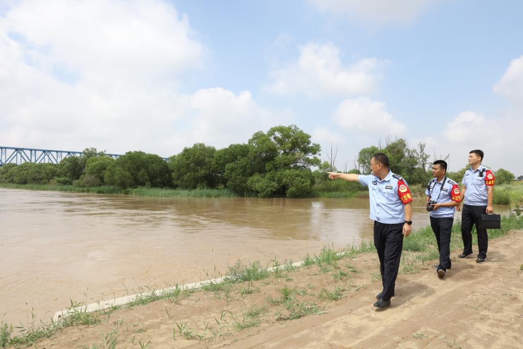 黃河派出所和黃河河務局水政監(jiān)察大隊人員對刁口河生態(tài)補水進行巡查。新華社記者 劉詩平 攝