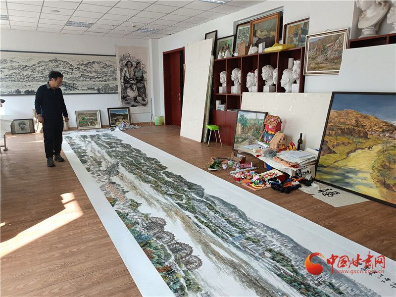 7年前,李建春曾經(jīng)在黑板上素描畫蘭州中山橋、白塔山走紅,在他的筆下蘭州就是一幅畫。這些年,李建春老師靜心創(chuàng)作,希望將蘭州的人文符號(hào)通過長(zhǎng)卷表達(dá)出來。