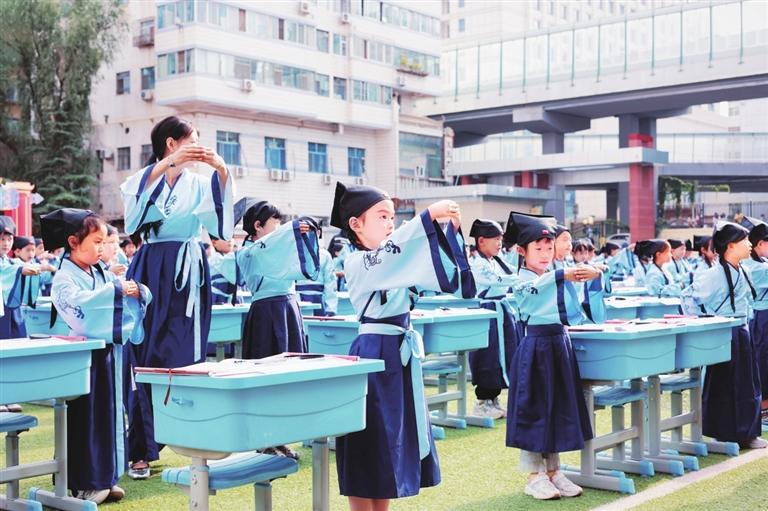 中國(guó)甘肅網(wǎng)9月2日訊 據(jù)蘭州晨報(bào)報(bào)道(奔流新聞·蘭州晨報(bào)記者裴強(qiáng)) 8月30日,蘭州市七里河教育集團(tuán)為七里河小學(xué)和中車(chē)分校的600名一年級(jí)新生舉行入學(xué)“開(kāi)筆禮”儀式。開(kāi)筆禮在中國(guó)傳統(tǒng)文化中是對(duì)少兒識(shí)字習(xí)禮的稱(chēng)謂,是標(biāo)志少兒進(jìn)入學(xué)習(xí)階段的重要紀(jì)念,是中國(guó)古代人生的首次大禮,孩子將要入學(xué)讀書(shū)寫(xiě)字、習(xí)禮之時(shí)的一個(gè)傳統(tǒng)禮節(jié)。兩所學(xué)校600名一年級(jí)新生“端正衣冠”“感恩先賢”“朱砂啟智”“擊鼓鳴志”“啟蒙描紅”,體驗(yàn)傳統(tǒng)“開(kāi)筆禮”儀式。
