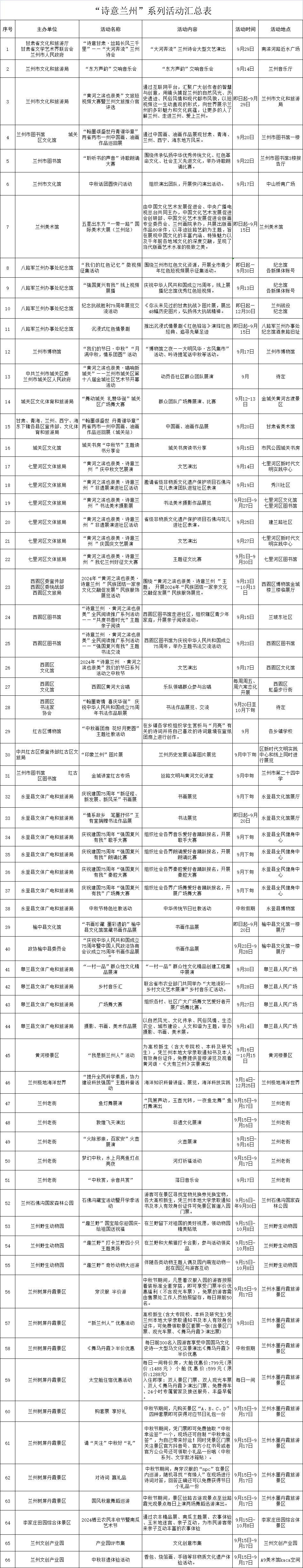 中國甘肅網(wǎng)9月14日訊(西北角·中國甘肅網(wǎng)記者 沈文剛)為預熱“大河奔流”蘭州詩會、豐富中秋假期文旅產品供給,蘭州市文旅局即日起至9月30日,推出“黃河之濱也很美·詩意蘭州”系列66項文旅活動,立足文化賦能旅游體驗,做優(yōu)產業(yè)、做實消費,為市民游客精心打造一場文旅服務盛宴。