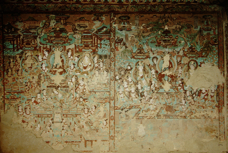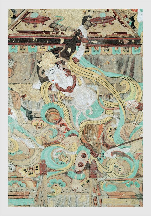 畫面中的人物造型嚴格遵循唐代仕女的畫風繪制,顯得豐腴飽滿,恰似盛唐時期雍容華貴的氣質(zhì)寫照。線描寫實明快,流暢飛動,一氣呵成,仿佛是畫師用靈動的筆觸在墻壁上勾勒出的生命樂章。畫面的顏色以石綠、赭黃、鉛白為主色。整個畫面顯得典雅、嫵媚,令人賞心悅目。雖然伎樂天頭部原本貼金的頭飾已經(jīng)剝落,但歲月的痕跡并未減損她雍容華貴的氣質(zhì),反而更增添了一份歷史的厚重感。