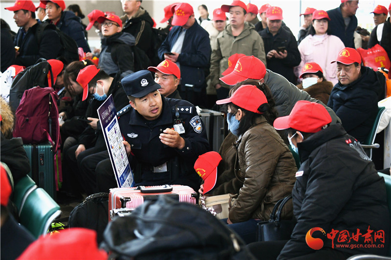 這批務(wù)工人員來自定西市各縣區(qū),既有復(fù)崗務(wù)工人員也有新聘崗務(wù)工人員,為鋪就這條溫暖返崗路,蘭州鐵路公安處定西北站派出所積極與定西北車站、客運部門通聯(lián),專門開辟綠色通道,暢通進站、安檢、檢票等進站環(huán)節(jié),劃定專門候車進站區(qū)域,同時,增派警力逐一引導(dǎo)務(wù)工人員有序進站,幫助提拿大件行李,講解防范電信詐騙小妙招,進一步保障了務(wù)工團體旅客乘車安全。