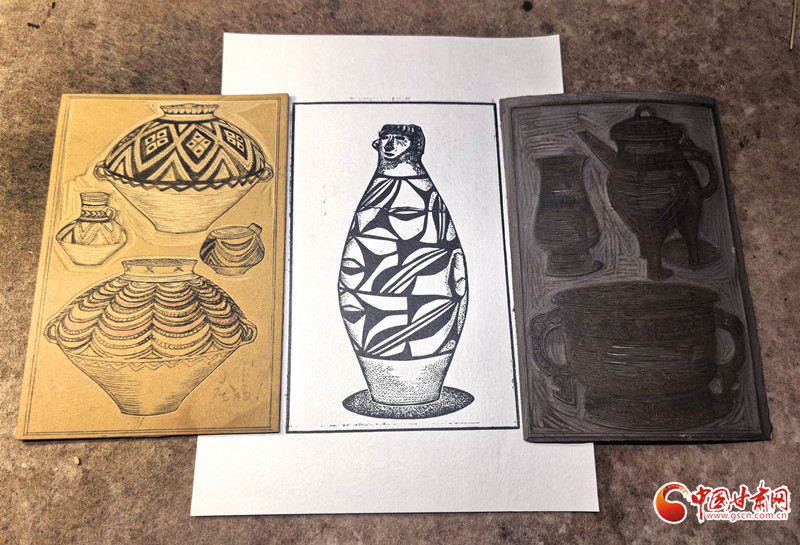 當(dāng)被問及如何將非遺符號轉(zhuǎn)化為現(xiàn)代語言時(shí),趙寧再次以《甘肅彩陶系列版畫》為例。自2018年起,他便持續(xù)探索彩陶紋樣與現(xiàn)代版畫的融合之道。他不斷嘗試新的表現(xiàn)手法和創(chuàng)作思路,通過獨(dú)特的創(chuàng)意和精湛的技藝,讓古老器物在木刻紙上“重生”。在他的刀下,彩陶紋樣不再是簡單的復(fù)制,而是被賦予了新的藝術(shù)生命,它們與現(xiàn)代版畫的元素相互交織、相互融合,形成了一種獨(dú)特而新穎的藝術(shù)風(fēng)格。