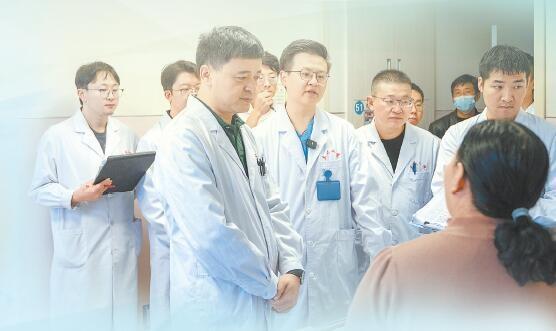 記者趕到住院部13樓普外科一病區(qū)時,查房已經(jīng)開始了:主任張輝走在前面,李昕和七八位年輕醫(yī)生跟在身后,魚貫進入一間間病房。“吃飯怎么樣?”“晚上能睡踏實嗎?”“能動就多動動。”醫(yī)患間簡短溫和的對話,是患者與家屬期待的時刻。