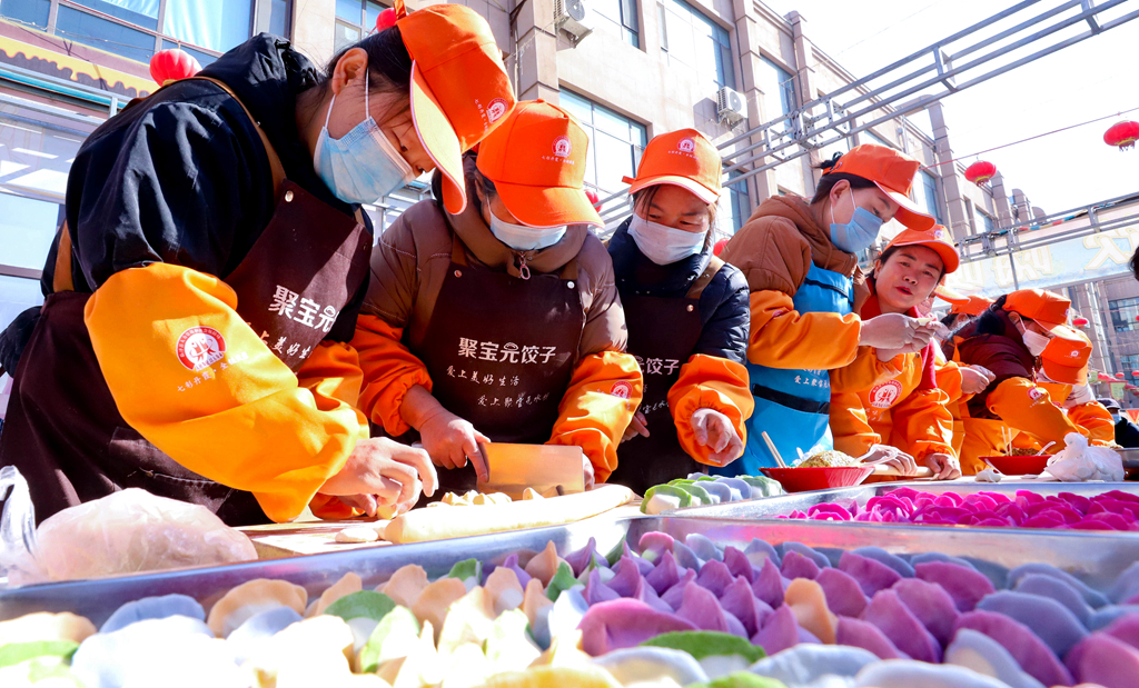 3月5日,臨澤縣金澤廣場(chǎng)美食創(chuàng)意展示大賽現(xiàn)場(chǎng),農(nóng)家巧廚娘在進(jìn)行“七彩水餃”制作比賽。