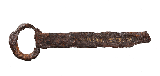 顧名思義,金馬書刀的得名與刀身上的馬形圖案有直接關(guān)系。文獻記載,漢代蜀地所產(chǎn)的金馬書刀馳名天下。西晉學(xué)者晉灼為《漢書》作注時提到:“舊時蜀郡工官作金馬削刀者,以佩刀形,金錯其拊(柄)。”東漢人李元有《金馬書刀銘》傳世:“巧冶煉剛,金馬托形。黃文錯鏤,兼勒工名。”用黃金錯鏤出馬的形象以及工匠姓名,跟實物遺存的特征相吻合。
