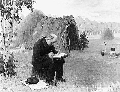 列寧在拉茲利夫湖畔匿居地寫(xiě)作《國(guó)家與革命》(油畫(huà))M.索科洛夫繪