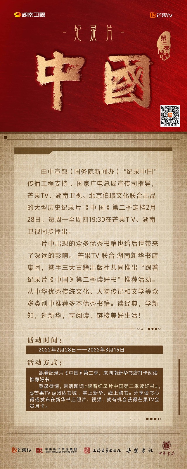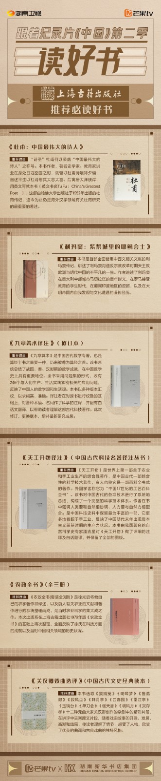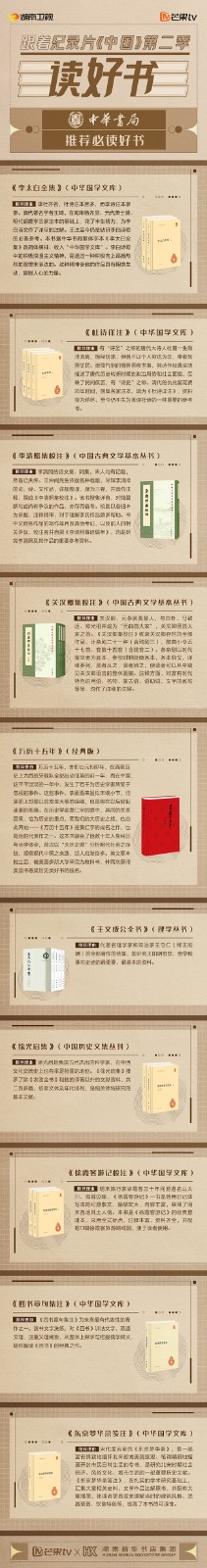 芒果TV以紀錄片《中國》第二季的精美品質(zhì),聯(lián)合湖南新華書店集團的美譽口碑,將中華書局、上海古籍出版社、岳麓書社推薦的珍品好書,傾情向大眾推薦。本次“跟著紀錄片《中國》第二季讀好書”活動,將從2月28日持續(xù)到3月15日,湖南新華書店集團旗下湖南圖書城、不吝Boolink書店、全省市級中心門店、長沙地區(qū)樂之書店等全員參與,推薦紀錄片《中國》第二季。書友及觀眾可登錄微博或到線下門店打卡參與活動。
