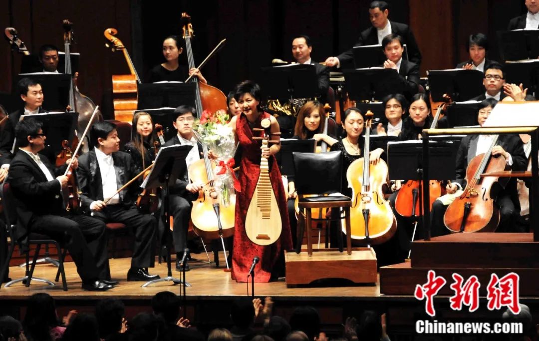 2009年2月,“琵琶皇后”美譽的章紅艷在美國肯尼迪藝術(shù)中心演奏《琵琶協(xié)奏曲》后謝幕。中新社記者 邱江波 攝