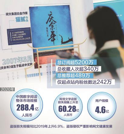 有數(shù)據(jù)顯示,2020年中國(guó)網(wǎng)絡(luò)文學(xué)市場(chǎng)規(guī)模為288.4億元,網(wǎng)絡(luò)文學(xué)通過(guò)IP全版權(quán)運(yùn)營(yíng)間接或直接影響了動(dòng)漫、音樂(lè)、影視、游戲等合計(jì)約2531億元的市場(chǎng),對(duì)數(shù)字文化產(chǎn)業(yè)的影響范圍超過(guò)40%。但令人痛心的是,2020年中國(guó)網(wǎng)絡(luò)文學(xué)盜版損失規(guī)模達(dá)60.28億元,同比上升6.9%。