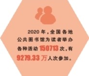 數(shù)據(jù)顯示,全國(guó)各級(jí)公共圖書館普遍開(kāi)展講座、展覽、閱讀指導(dǎo)、讀書交流、演講誦讀等活動(dòng)。僅2020年,各地公共圖書館就為讀者舉辦各種活動(dòng)150713次,有9279.33萬(wàn)人次參加。