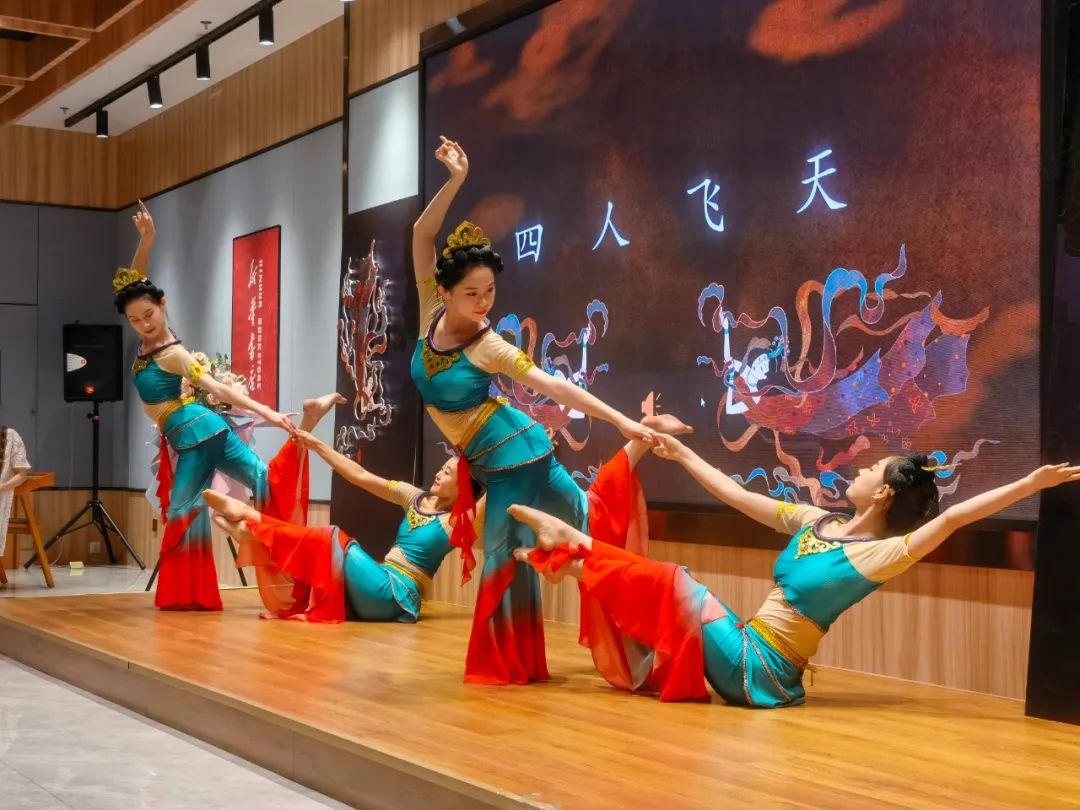 見面會現(xiàn)場,作者介紹了本書創(chuàng)作歷程,并通過“形、神、氣、韻”“抻、曲”“舞姿控制”“四臂觀音”“四人飛天”“胡旋與琵琶”等組合精彩紛呈的表演,使讀者更加直觀地了解本書的主要內(nèi)容和敦煌舞蹈的文化內(nèi)涵,感受敦煌舞蹈傳遞出的藝術(shù)價值、文化素養(yǎng)和無窮的魅力。