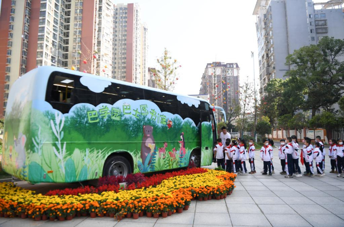 近日,長沙市青園友誼小學(xué)的巴士圖書館開館,吸引學(xué)生們前來閱讀、體驗(yàn)。巴士圖書館由一臺(tái)廢棄巴士改造而成,目前共藏書4000多冊(cè)。