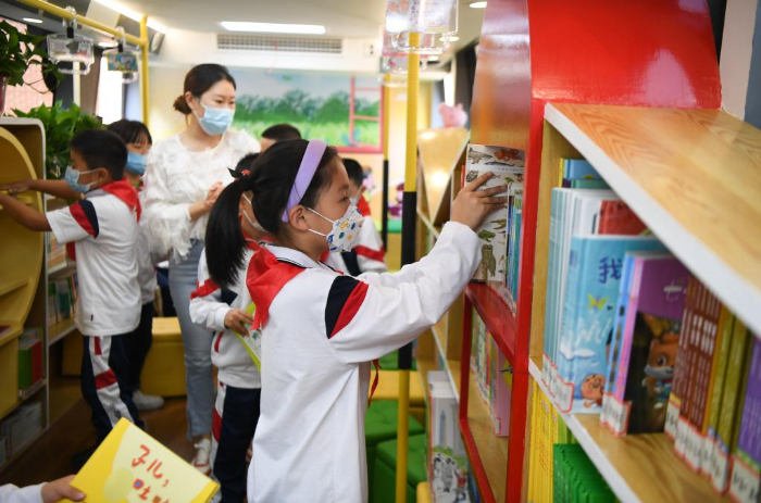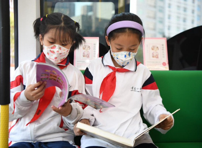 11月10日,學(xué)生在長沙市青園友誼小學(xué)巴士圖書館內(nèi)閱讀。