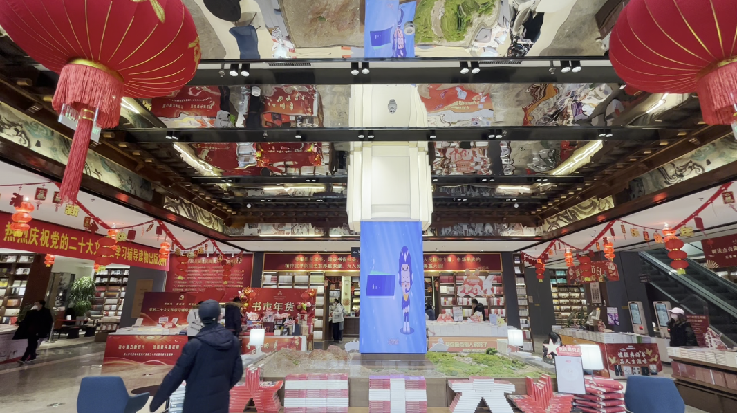 走進(jìn)甘肅省新華書(shū)店西北書(shū)城,這里裝扮一新,高高掛起的大紅燈籠烘托出濃濃的年味,敦煌文化元素的有機(jī)融入,讓中華優(yōu)秀傳統(tǒng)文化在這里流光溢彩。書(shū)城一樓的主題出版物展區(qū),勉勵(lì)人們熱愛(ài)讀書(shū)的標(biāo)語(yǔ)豁然醒目 。