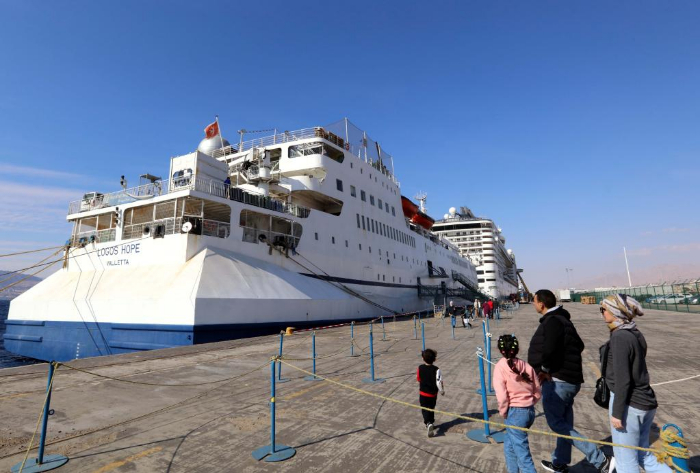 2月13日,在約旦亞喀巴港,人們前往“望道號(hào)”參觀。