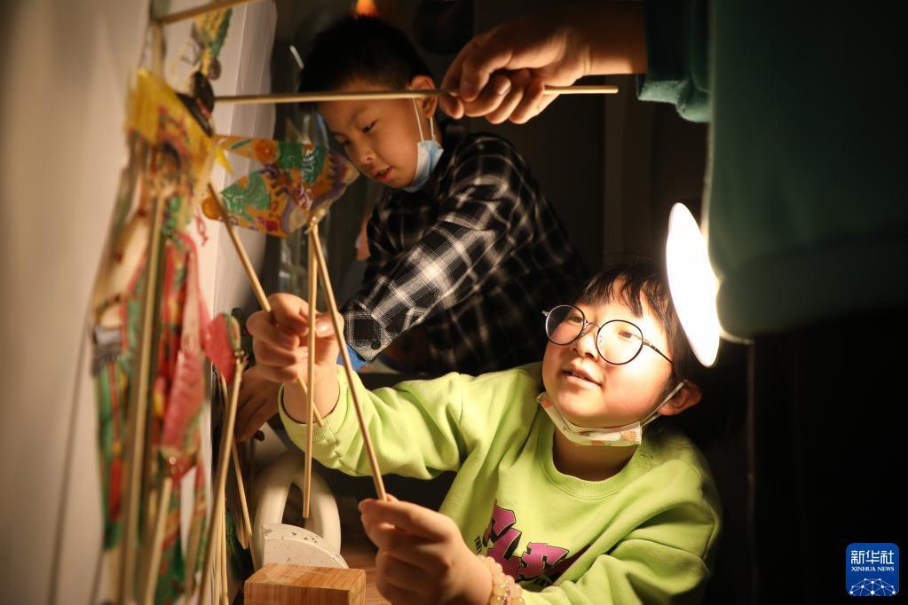 4月1日,在甘肅省蘭州市的讀者出版集團數(shù)字閱讀中心讀者小站,小朋友體驗中國神話故事主題皮影戲。新華社記者 馬希平 攝