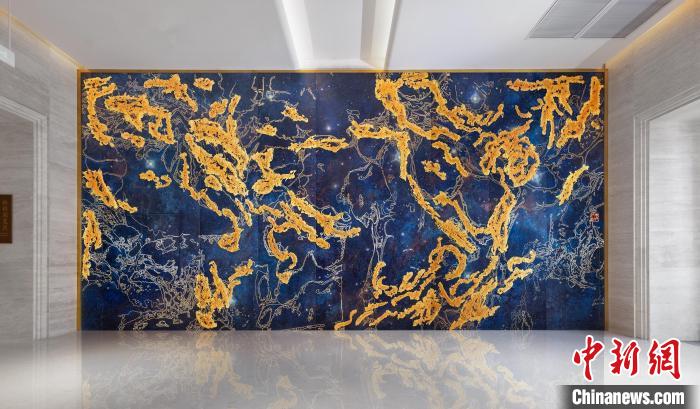 記者了解到,這幅熔銅壁畫(huà)采用國(guó)家級(jí)非遺銅雕技藝,結(jié)合熔銅藝術(shù)、釉彩著色等創(chuàng)新技藝制作而成,從設(shè)計(jì)、制作、誕生,全程歷時(shí)一年,難度很大。壁畫(huà)以朱炳仁手繪的星空“云水墨”制作,用大面積深藍(lán)宇宙為底,采用熔銅藝術(shù)構(gòu)成繁星點(diǎn)點(diǎn)。