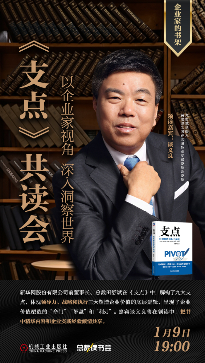 為了企業(yè)家更好地塑造企業(yè)價(jià)值,提升格局和眼界,1月9日19:00九如城創(chuàng)始人談義良將領(lǐng)讀《支點(diǎn)》一書,將在“認(rèn)識(shí)管理”視頻號(hào)上進(jìn)行直播。通過如何從多維度視角塑造企業(yè)價(jià)值、如何提升企業(yè)家的格局和眼界、如何做好團(tuán)隊(duì)塑造,構(gòu)筑人力資本基石三個(gè)方面,從企業(yè)家視角把書中精華內(nèi)容和企業(yè)實(shí)踐經(jīng)驗(yàn)傾情共享,千萬別錯(cuò)過。