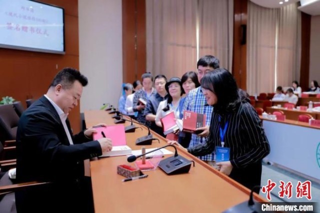 圖為邱華棟向部分參會代表進行現(xiàn)場簽名贈書?!?nèi)蒙古師范大學(xué)供圖