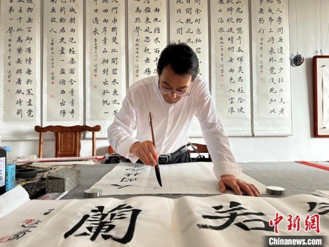 當日,中新網(wǎng)記者跟隨通渭詩會采訪團走進通渭悅心國際書畫村。“我們這里重視寫字是刻在骨子里的,書法特長班比重遠高于音樂舞蹈等,而且從小學至高中每周有兩節(jié)書法課程。”工作人員冉盼盼說,由于祖輩傳承,書法在通渭不衰反盛,當?shù)匾呀?jīng)形成了書畫裝裱、文房四寶銷售等完整產(chǎn)業(yè)鏈。
