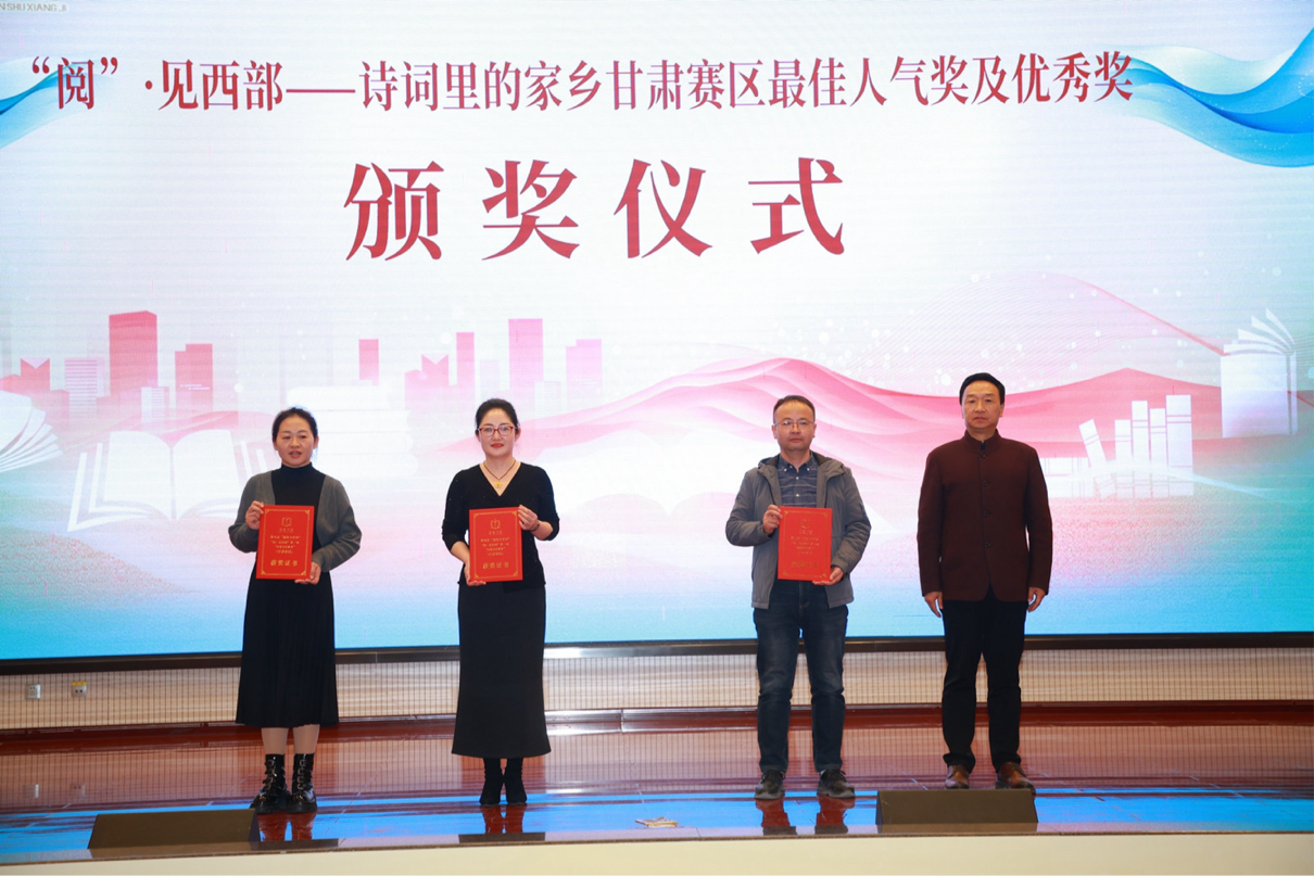 閉幕式上公布并表彰了“優(yōu)秀閱讀推廣活動(dòng)案例獎(jiǎng)”獲獎(jiǎng)人員、“‘穿越古今·夢(mèng)回隴右’詩(shī)詞大賽優(yōu)秀組織獎(jiǎng)”獲獎(jiǎng)人員、“‘閱·見西部’第一季——‘詩(shī)歌里的家鄉(xiāng)’(甘肅賽區(qū))最佳人氣獎(jiǎng)和優(yōu)秀獎(jiǎng)”獲獎(jiǎng)人員。