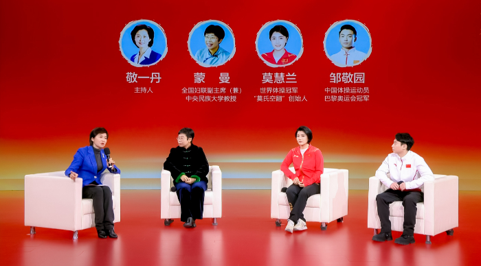全國婦聯(lián)副主席(兼)、中央民族大學(xué)教授蒙曼,世界體操冠軍、“莫氏空翻”創(chuàng)始人莫慧蘭,中國體操運(yùn)動(dòng)員、巴黎奧運(yùn)會(huì)冠軍鄒敬園接受訪談。新華網(wǎng) 發(fā)