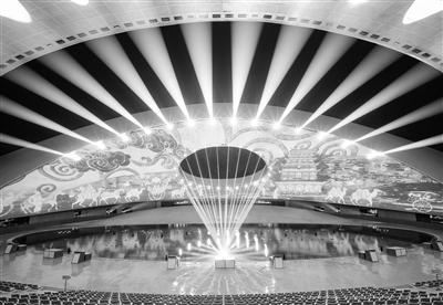 華夏文化展示中心分為展演區(qū)與展示區(qū)兩個部分,展示區(qū)為古鎮(zhèn)式商業(yè)街,目前已進入收尾階段,展演區(qū)為大型激光水舞秀劇場——日月館,去年已試運營,效果極佳。別名“黃河巨蛋”的日月館總用地面積為12000平方米,場館外形呈半橢圓形,由兩片獨立的頂棚覆蓋,場館高30米,寬約80米,內(nèi)設(shè)觀眾席位1450座。場館屋頂?shù)奶煅坶_口和場館地面體現(xiàn)了中國天圓地方的理念以及太陽和月亮的互相映襯。外立面采用了與當(dāng)?shù)貍鹘y(tǒng)屋頂瓦片相呼應(yīng)的獨特形狀,又像鳥兒折疊的翅膀和羽毛,極富活力和寓意。
