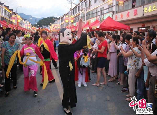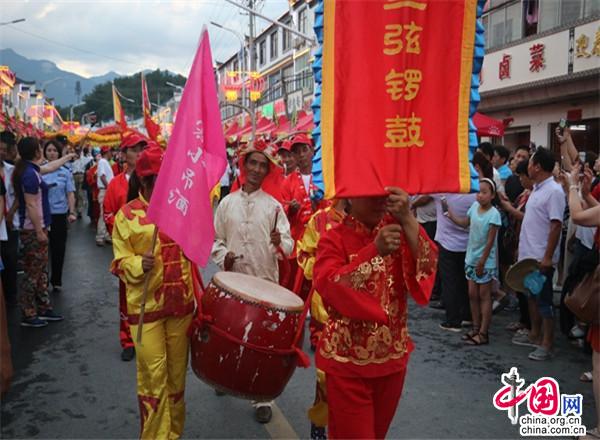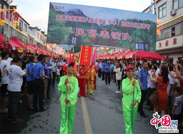小鎮(zhèn)很熱鬧。小鎮(zhèn)現(xiàn)已入駐了十幾家大型連鎖超市,500多家賓館飯店,300多家購(gòu)物店。每到雙休日,操著各色口音的四海賓客在街上蹓跶、徜徉,或在超市購(gòu)物店里選購(gòu)精美的土特產(chǎn),或在酒店里品嘗著山珍野味,或在KTV里痛快豪嗓,或圍著篝火歡歌勁舞,有的干脆就光著膀子在露天的小吊鍋前劃拳行令,恣意灑脫,好不愜意。每年農(nóng)歷六月初六,天堂寨都要舉辦隆重的天貺節(jié),天堂寨鎮(zhèn)政府門前的一公里主街道兩邊擺起了長(zhǎng)龍似的紅色帳篷,“百家吊鍋宴”成為中外游客免費(fèi)品嘗天堂寨美食的饕餮盛宴。人們一邊喝著小吊美酒,吃著山珍美味,一邊欣賞著穿街而過的威風(fēng)鑼鼓、騰龍舞獅、儺戲花船、獨(dú)輪推美女、花棍打癡郎等不斷推陳出新的民俗風(fēng)情表演。酒足飯飽之后,再到政府廣場(chǎng)觀看精彩紛呈的文藝節(jié)目。一時(shí)間,人山人海,把一個(gè)千米“長(zhǎng)街”擠得水泄不通;歡聲笑語,把一個(gè)深山小鎮(zhèn)匯成了歡樂的海洋……
