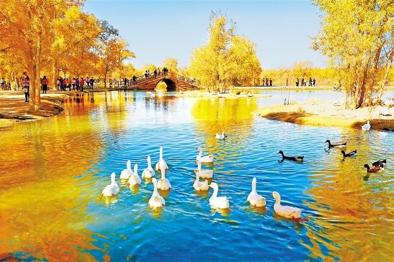 站在金波湖邊,滿目的赤橙黃綠與盈盈秋水互相映襯,胡楊金色的葉子倒映在潭水中,形成金色的水泊,微風(fēng)掠過,層層漣漪漸漸擴(kuò)大,最后消失在胡楊的倩影里,構(gòu)成一幅幅精美的油畫。烘托出一幅“碧云天、黃葉地、秋色連波、波上寒煙翠”的絕美妙油畫卷。