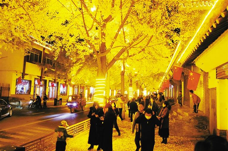 立冬前后,被稱為“黃金大道”的天水市青年南北路銀杏一條街,黃葉飛舞一地金黃,迎來(lái)一年中最佳觀賞期。 天水市秦州區(qū)青年南北路全長(zhǎng)700余米,道路兩側(cè)種滿了銀杏樹。落葉季節(jié),每到夜幕降臨后,銀杏樹上的LED金黃色燈帶亮燈后,整條街黃葉黃燈交相輝映,璀璨奪目,成了市民近日遛彎首選的“打卡”地。