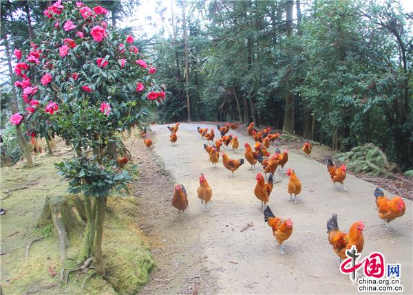 茶花具有“唯有山茶殊耐久,獨(dú)能深月占春風(fēng)”的傲梅風(fēng)骨,又有“花繁艷紅,深奪曉霞”的凌牡丹之鮮艷,因此自古以來就是極富盛名的木本花卉,在唐宋兩朝達(dá)到了登峰造極之境,直到十七世紀(jì)引入歐洲后,造成轟動,也因此獲得“世界名花”的美名。九龍街道牛街居委會小寨土雞生態(tài)產(chǎn)業(yè)園嬌艷的茶花給人一種神圣感,同時被賦予了一種原始的信仰:山茶是春天的神木,是春天的圣樹。置身九龍小寨土雞生態(tài)產(chǎn)業(yè)園,來一場與森林的浪漫邂逅,恍如仙境。園里有枇杷林、櫻桃林、楊梅林、梨樹林、紅豆杉林、柏樹林、椿樹林、油桃林、核桃林、灌木林以及草莓園、蔬菜園、山茶花園、荷花園,樹下是一群群羽毛鮮亮的土雞悠閑地覓食,好一幅田園風(fēng)景畫!