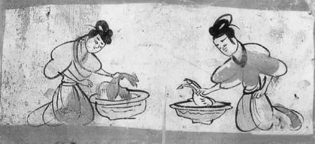 燙雞圖壁畫磚就出土于5號墓葬,這是繪制在一塊單塊磚面上的壁畫,磚面上用刷得甚薄的含膠白堊土作底,正中繪制二婢相對跪坐,袖子高高挽起,眉毛微撇,聚精會神地在各自的盆內(nèi)燙雞去毛。左邊盆內(nèi)雞有冠,為公雞形象;右邊盆內(nèi)雞無冠,似為母雞形象。用色較為單純,以墨、赭石和朱為主。畫面寥寥數(shù)筆,將婢女勞動的情況表現(xiàn)得淋漓盡致,極具生活趣味。尤其是雞脖子被抓住的樣子非常傳神, 生動地表現(xiàn)出寫實(shí)的情境。我們從中可以看到,1600多年前的人們殺雞處理食材,跟現(xiàn)在我們殺雞燙毛毫無二致。