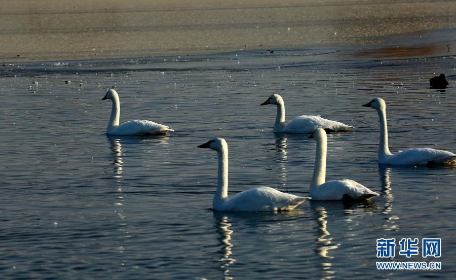 冬日清晨的甘肅省張掖國家濕地公園里碧波蕩漾,成群的白天鵝、黑天鵝等鳥類聚在一起游弋嬉戲,歡騰跳躍,成為一道亮麗的風(fēng)景線,吸引眾多游客觀賞拍照。新華網(wǎng)發(fā)(陳禮 攝)
