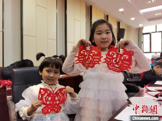 圖為蘭州孩童展示剪紙作品《小老虎》《蝴蝶》?!⌒煅?nbsp;攝