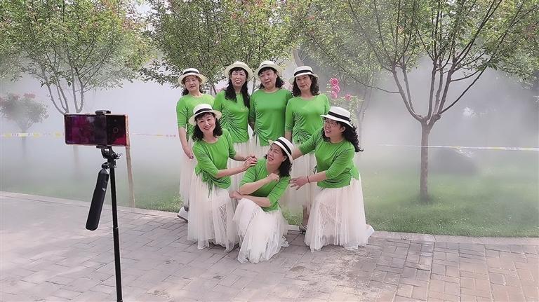 上午9時30分,水池中漸漸漫出淡淡的煙霧,時而稀薄,時而濃厚,隨著陣陣微風飄蕩在小橋流水間。“準備放音樂,我在原地來回轉,你用手機豎屏拍。”……記者穿梭于人群間,這樣的聲音不絕于耳。“姐妹花”龔大姐和田大姐身穿正裝,各自圍上了顏色艷麗的圍巾,正站在鏡頭前直播。“這里非常美,像仙境一樣。綠化也做得特別好,公園里的綠植和鮮花種類繁多,很好看。我們是第一次來,希望蘭州多打造一些這樣的美景。”
