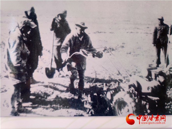 上個世紀40年代,山丹四壩灘上,山丹培黎學校農業(yè)組的學子在種地中學習,還實施了灌溉引水澆地。