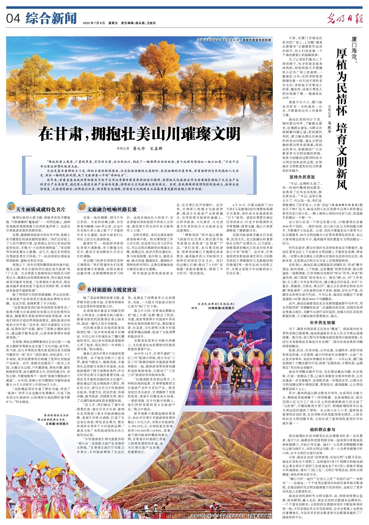 陳衛(wèi)中介紹,甘肅省近期推出的“隴上鄉(xiāng)遇”品牌,整合了民俗、非遺、美食等夏季鄉(xiāng)村旅游中具有特色優(yōu)勢的資源和產(chǎn)品,策劃觀光游、生態(tài)游、文化游等15條鄉(xiāng)村旅游夏季精品線路,促進(jìn)了文旅消費(fèi)的穩(wěn)步回升。