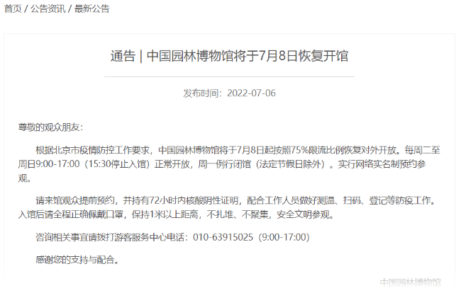 中國(guó)園林博物館發(fā)布最新消息,根據(jù)北京市疫情防控工作要求,中國(guó)園林博物館7月8日起按照75%限流比例恢復(fù)對(duì)外開放。