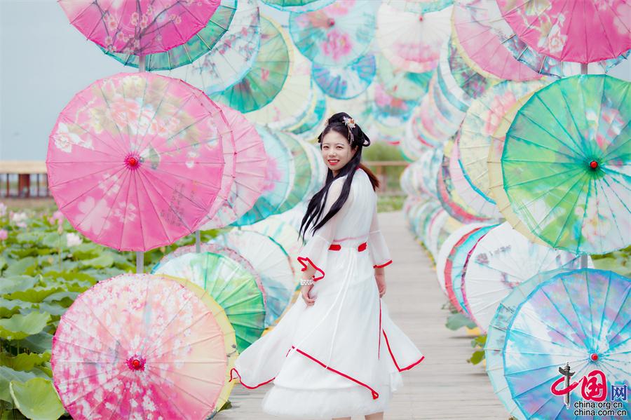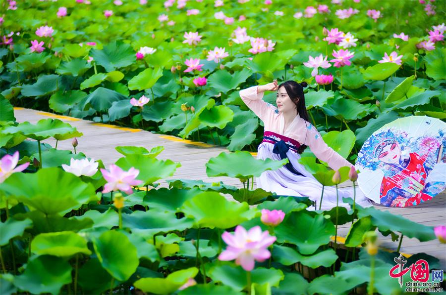 寧夏沙湖: 接天蓮葉無(wú)窮碧 國(guó)風(fēng)漢服映荷塘(圖)