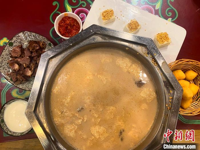 5月28日,呼和浩特市一家奶茶店里,每桌一口小銅鍋,奶皮、奶豆腐、奶嚼口(牛奶凝結(jié)乳的上層)、肉干、炒米、奶油、黃油、果條(蒙古族的一種炸制面食)等十幾樣奶茶“伴侶”供君選擇。中新社記者 張瑋 攝