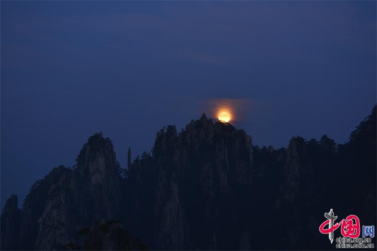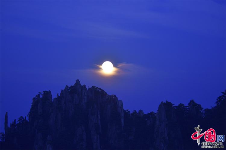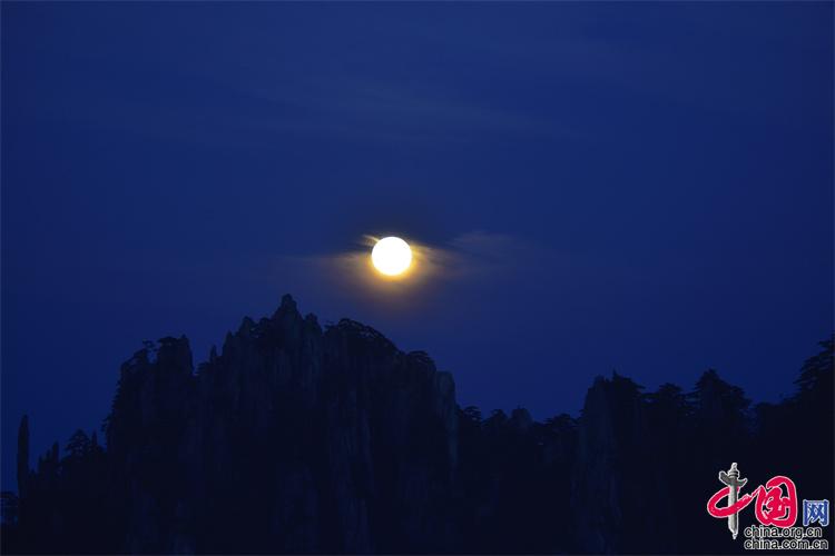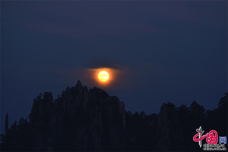 9月10日,中秋之夜,7點(diǎn)左右月亮如約而至,躍出地平線,穿過群峰峻嶺,露出了它靚麗的臉龐。剛出的時(shí)候,月亮和初升的太一樣是帶紅色的,隨著慢慢的升起越來越明亮,這時(shí)的黃山在月光照射下變得很清新。(姚育青)